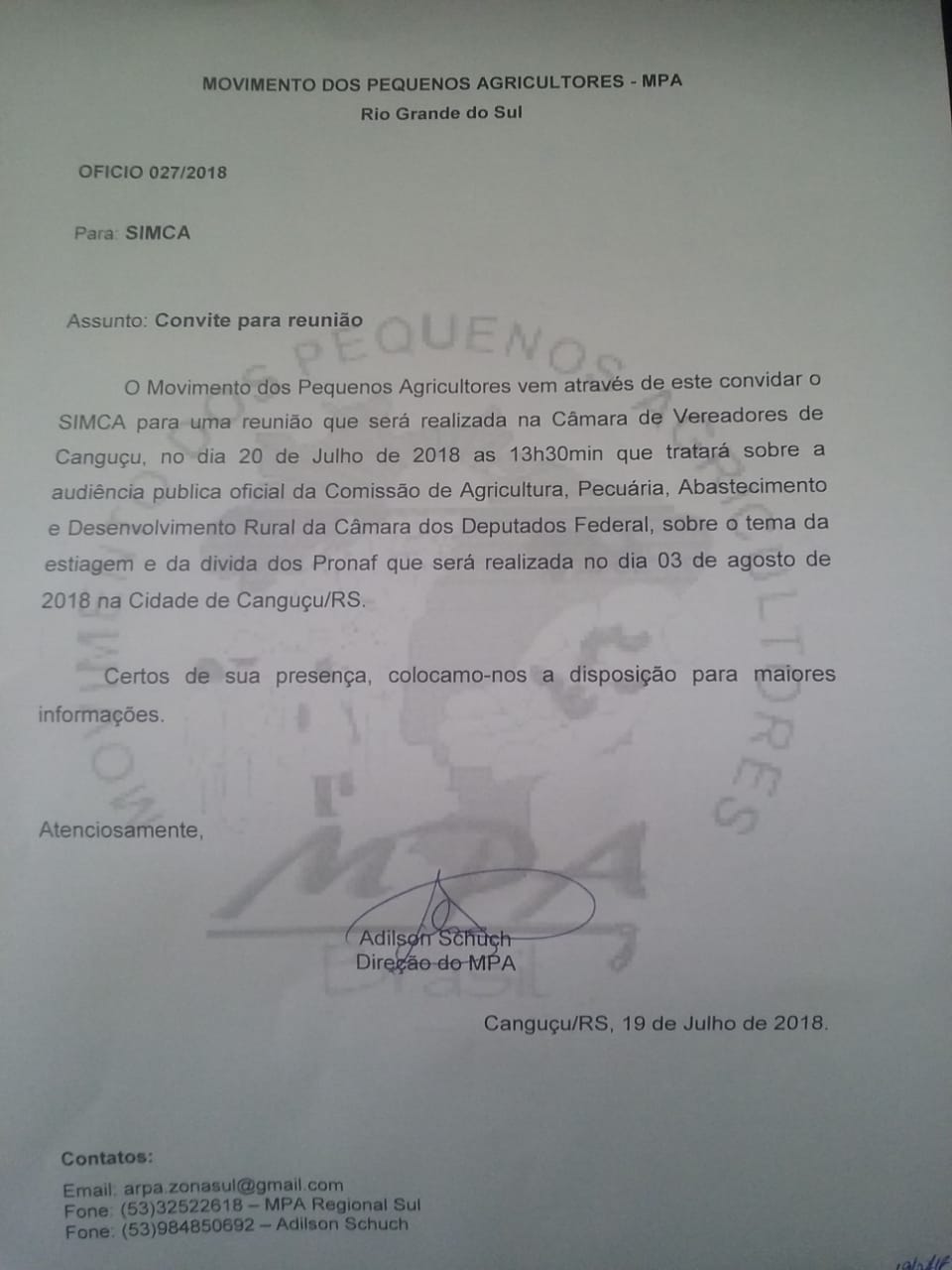 MPA convida SIMCA para reunião sobre dívidas do PRONAF